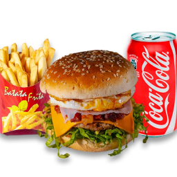X-tudo completo acompanhado com 150g de batata frita e uma coca lata.